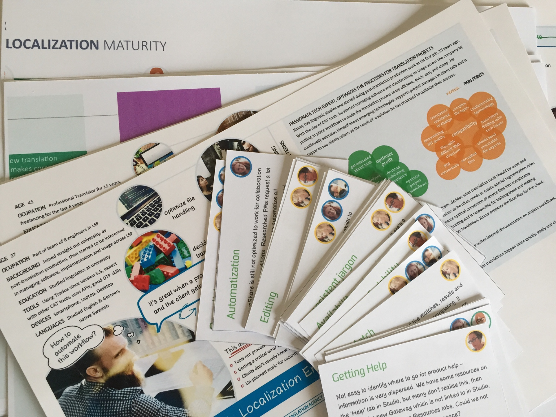 The result was the decision to focus on only two (of four) customer profiles, the Professional Translator and the Project Manager. The other two profiles would follow along because of the way they were collaborating in the localization workflows. Then we decided to take a closer look at our ecosystem (see Usability in systems).